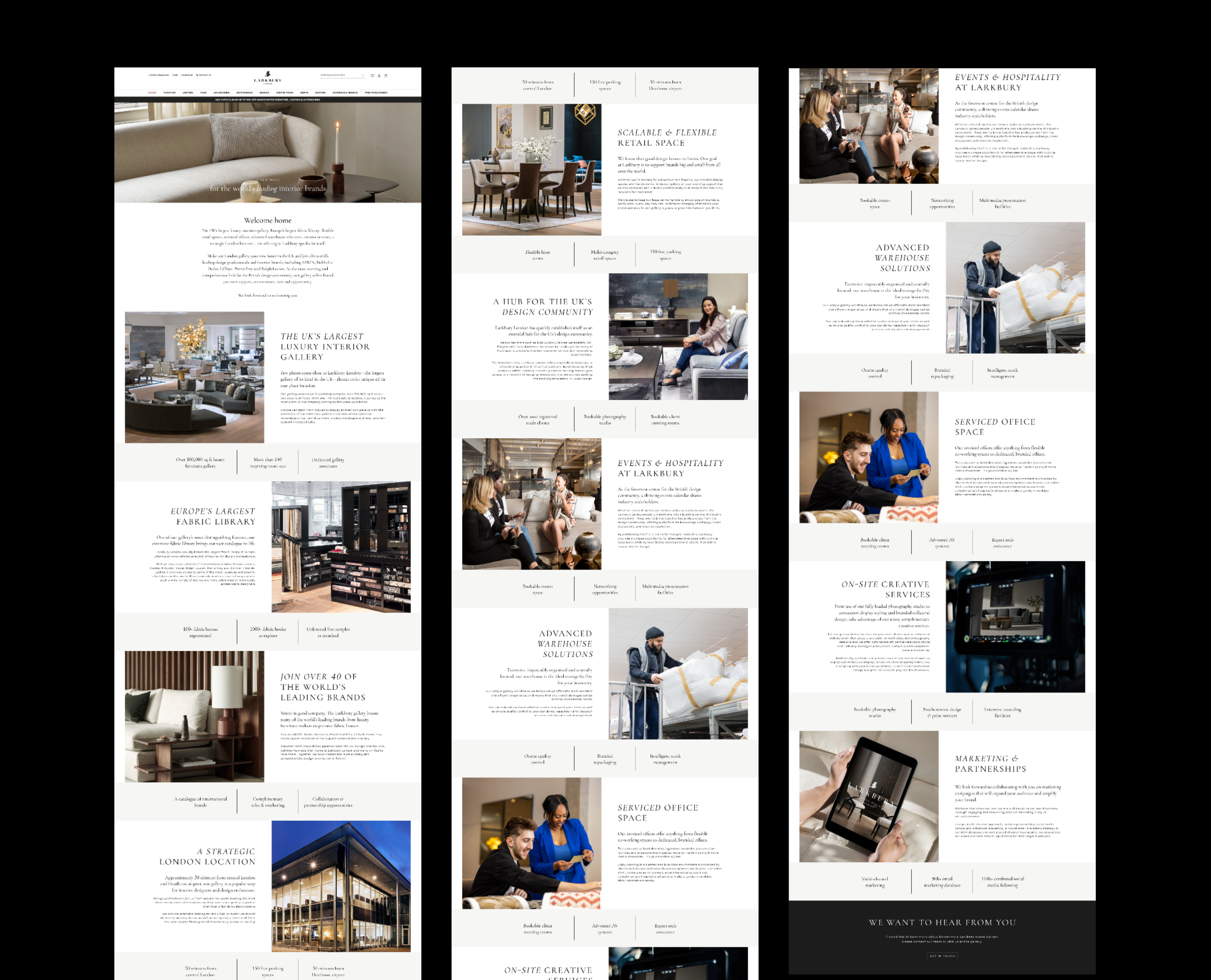 I designed an additional Brand Partners page to showcase the wider Larkbury offering, including the interior gallery, fabric library, and procurement and logistics support. The page positions Larkbury as a comprehensive interior destination beyond retail.