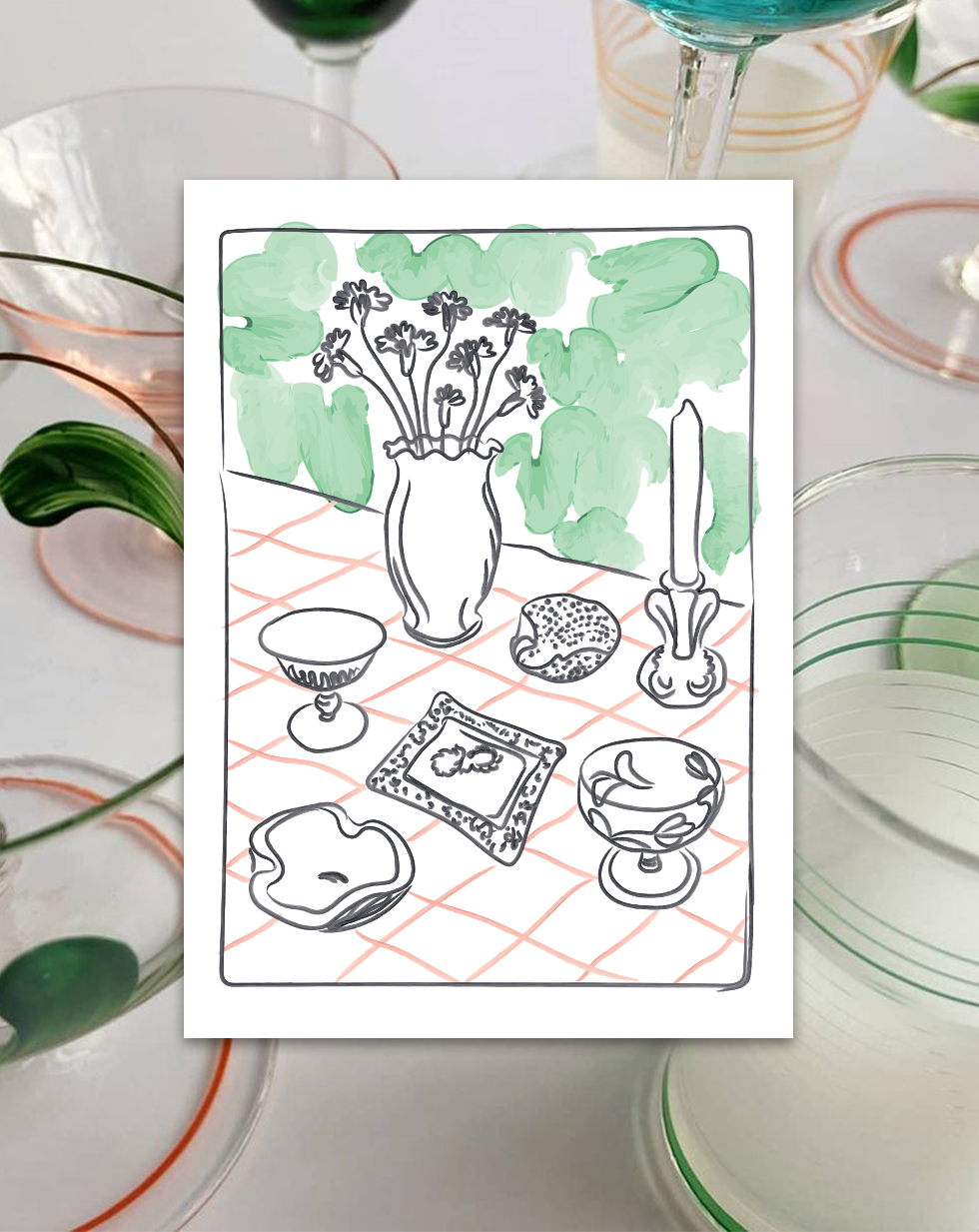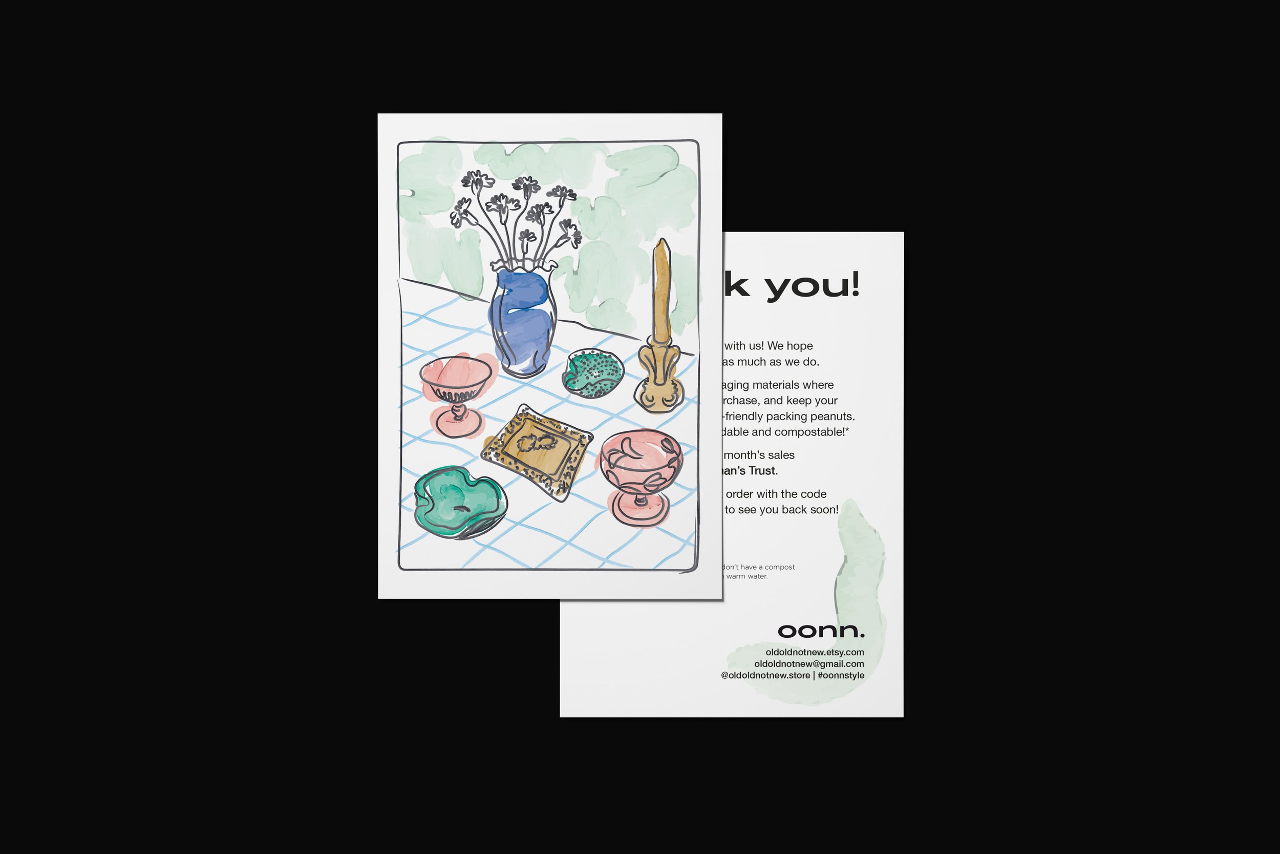 Independent vintage store oldoldnotnew.store asked me to design a thank you postcard to include in customer deliveries. Drawing inspiration from a selection of their favourite pieces, I created an illustration that showcased their unique product offering, incorporating subtle touches of the brand’s colour palette to ensure a thoughtful and visually cohesive design.