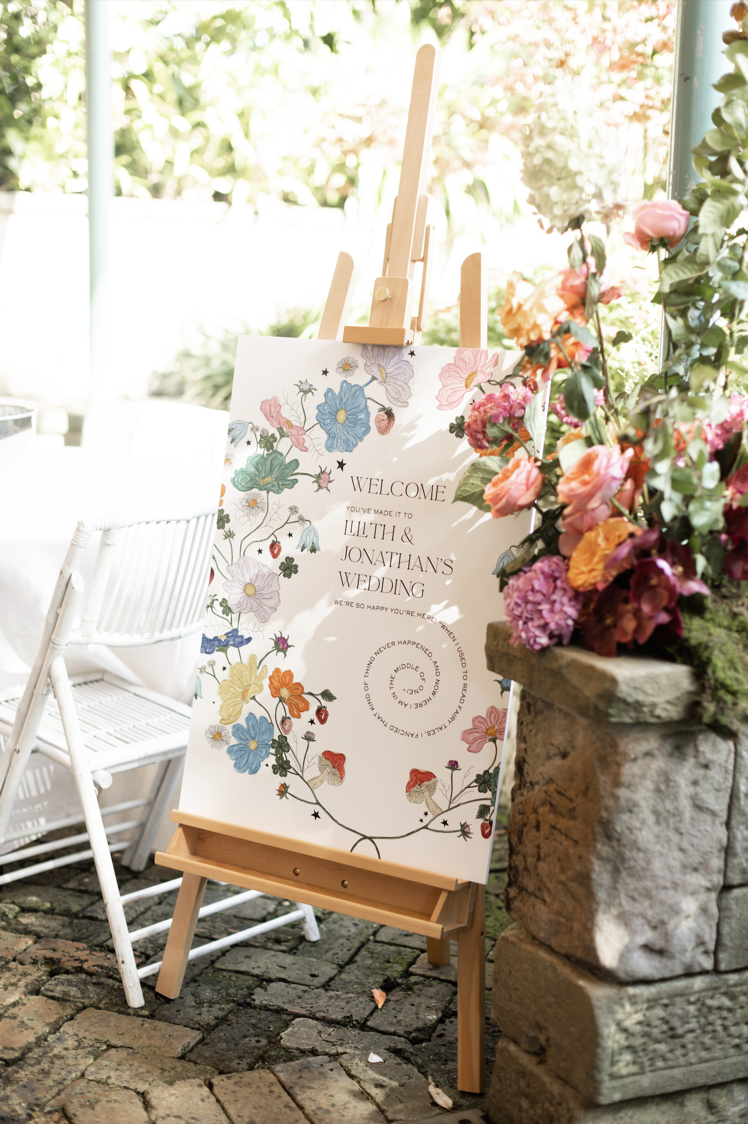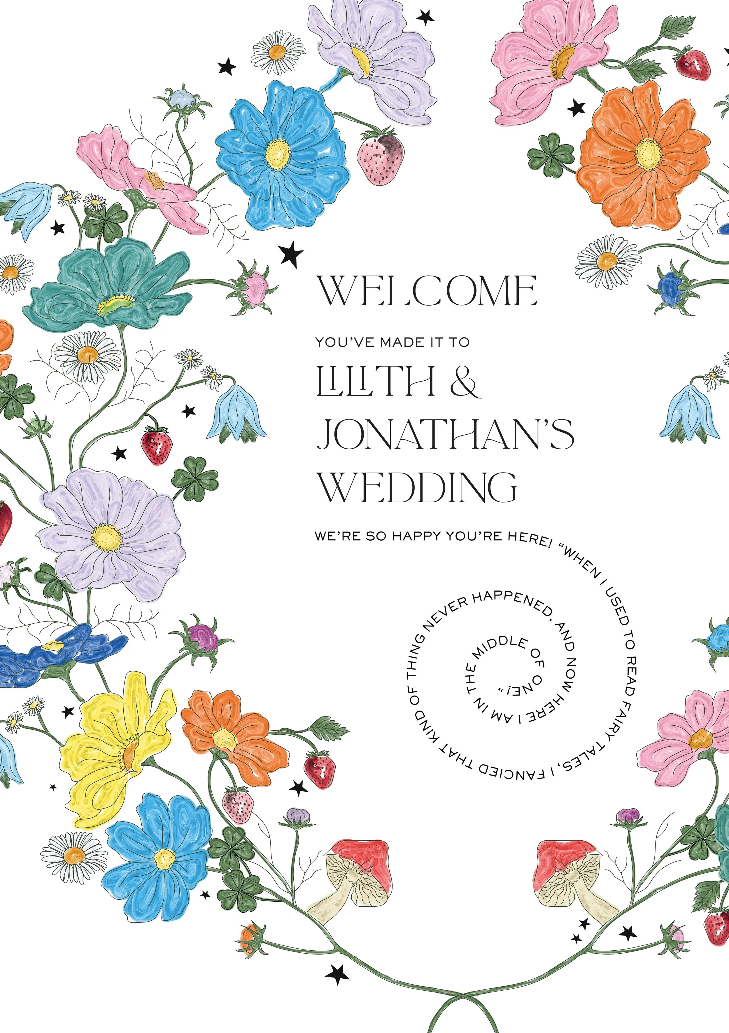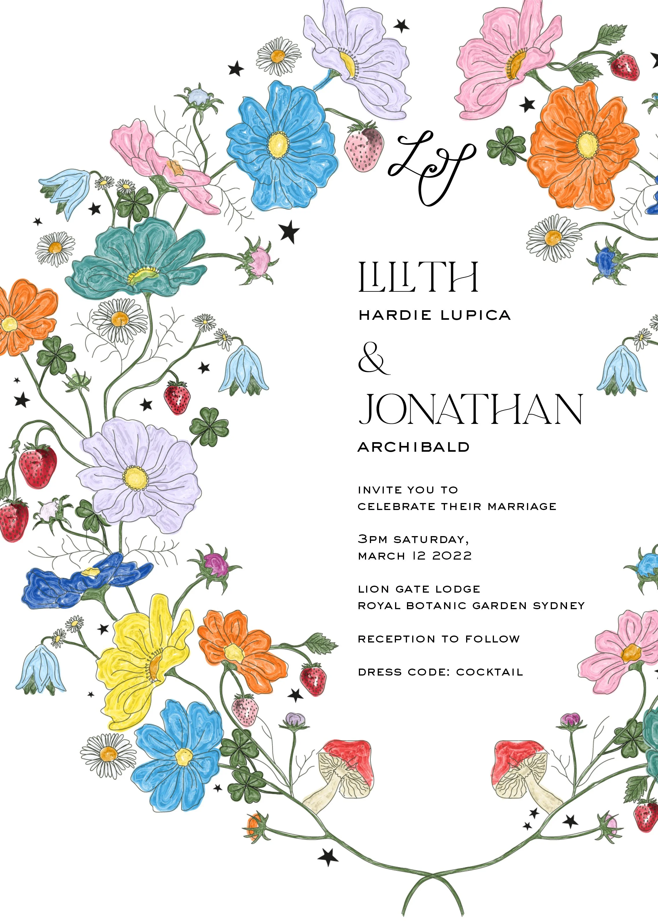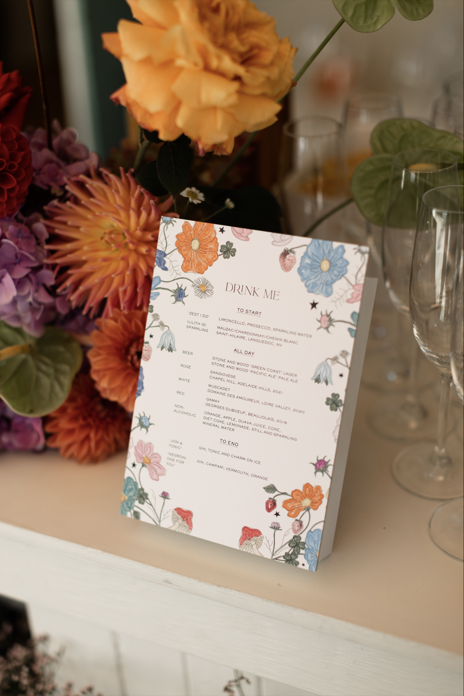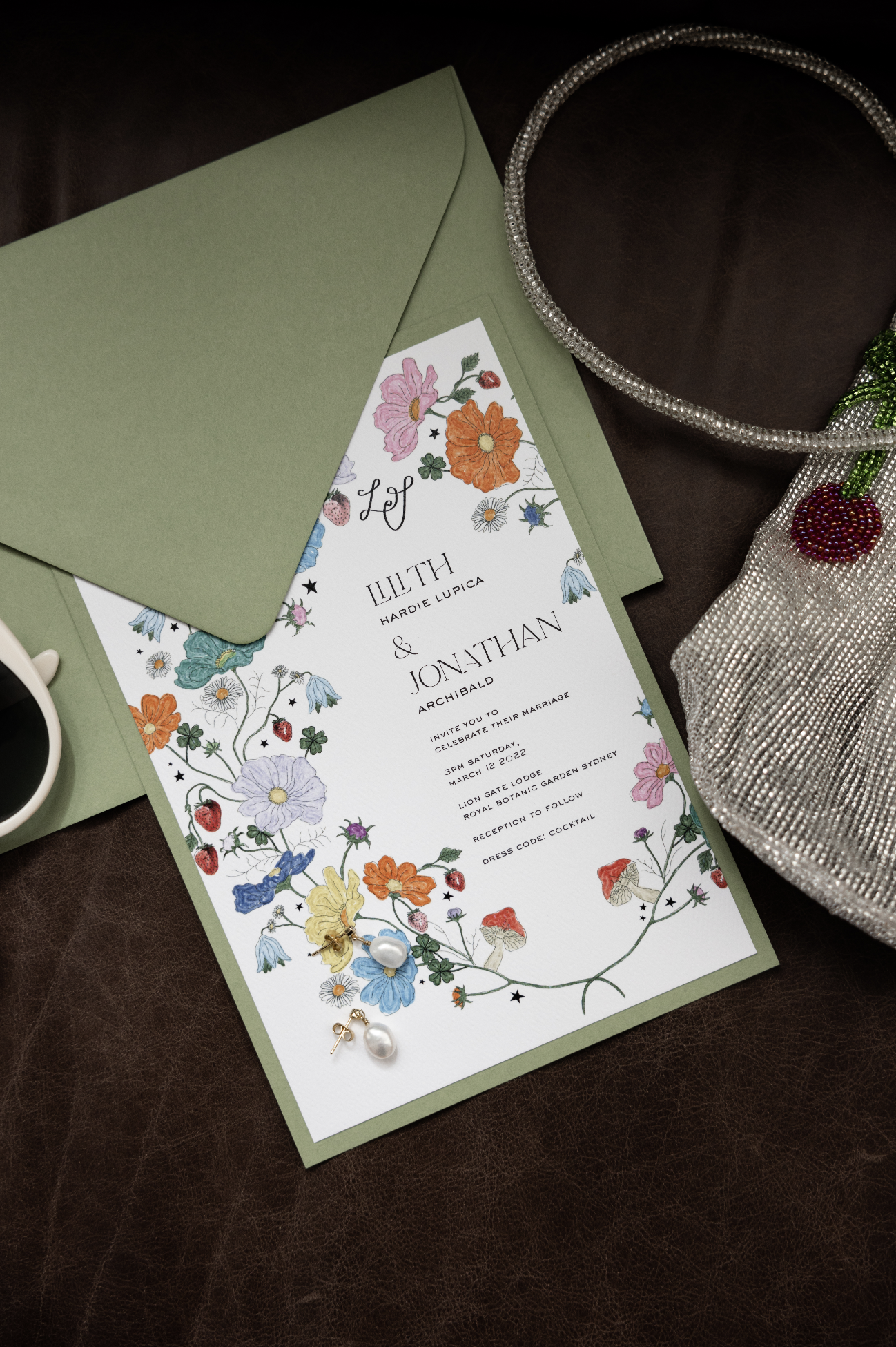 I created bespoke wedding invitations and supporting collateral that reflected the couple’s personality, their engagement location, and their venue—the Royal Botanic Gardens in Sydney. The design featured a hand-drawn monogram within a botanical wreath, with a focus on the Cosmos flower. Traditional foliage was complemented by playful, whimsical elements—strawberries, mushrooms, and miniature stars—adding a subtle, psychedelic Alice in Wonderland touch to the overall aesthetic.