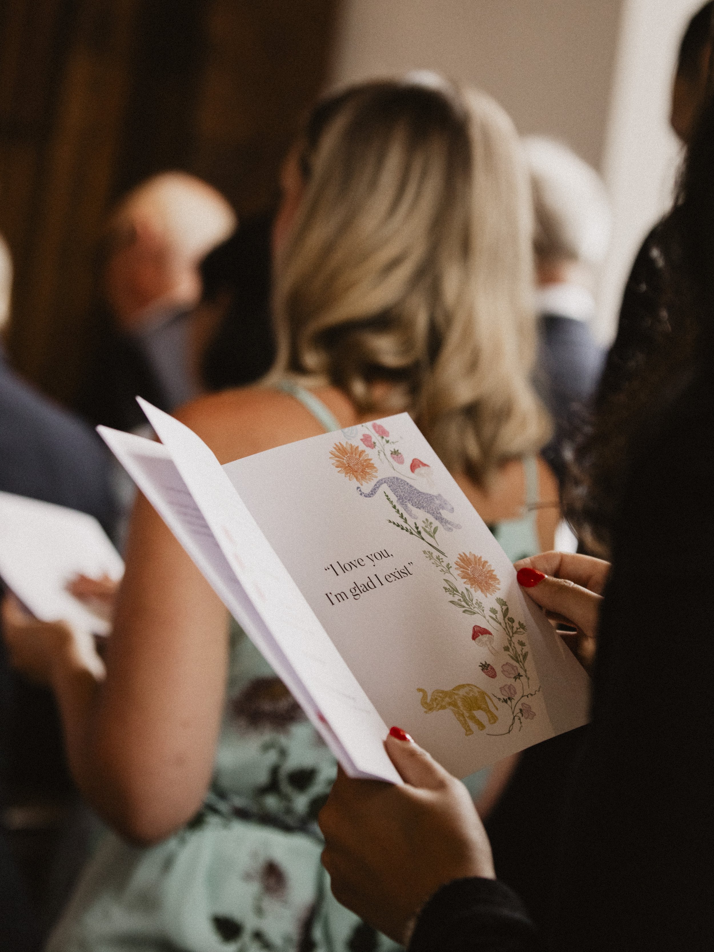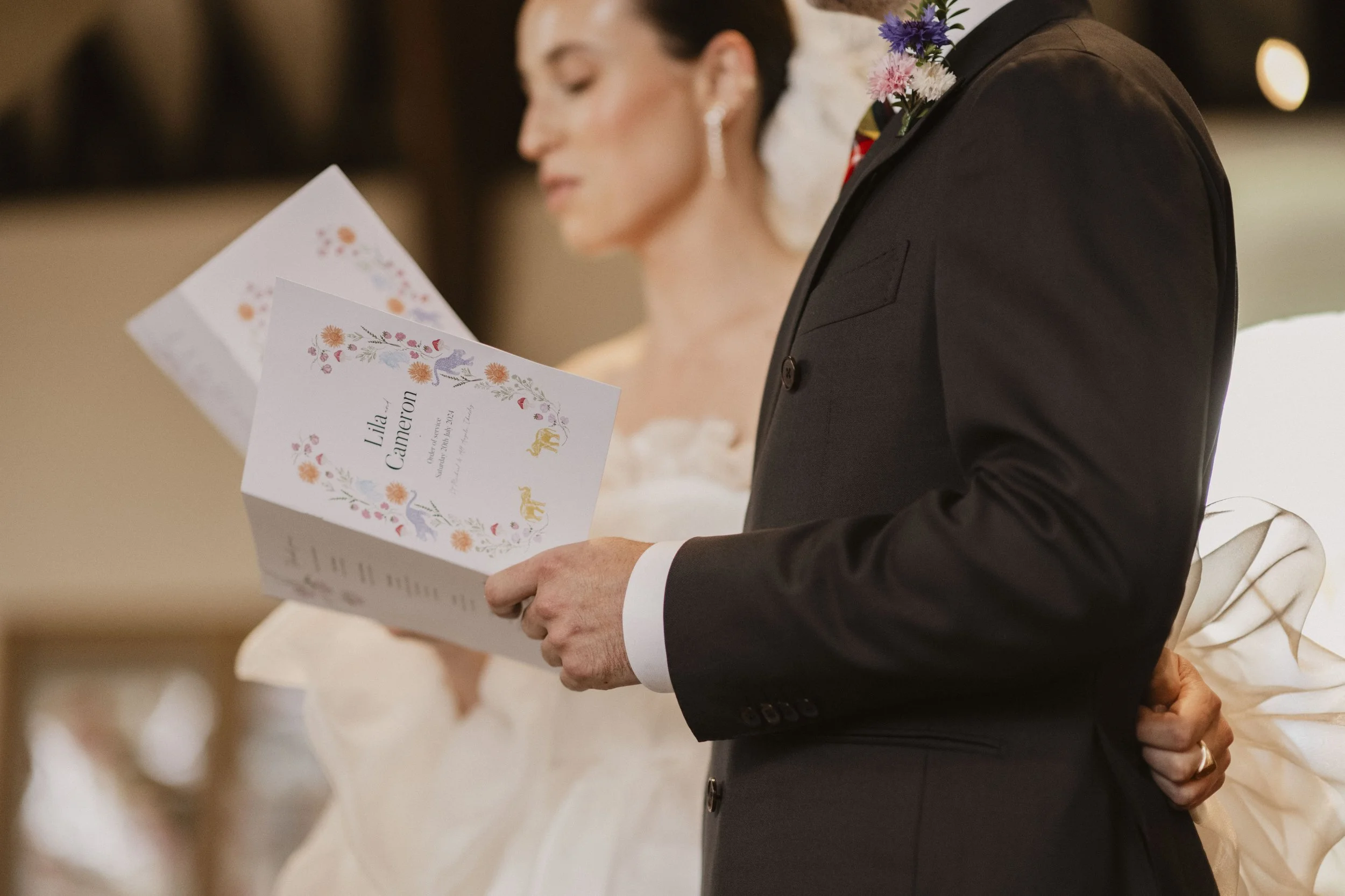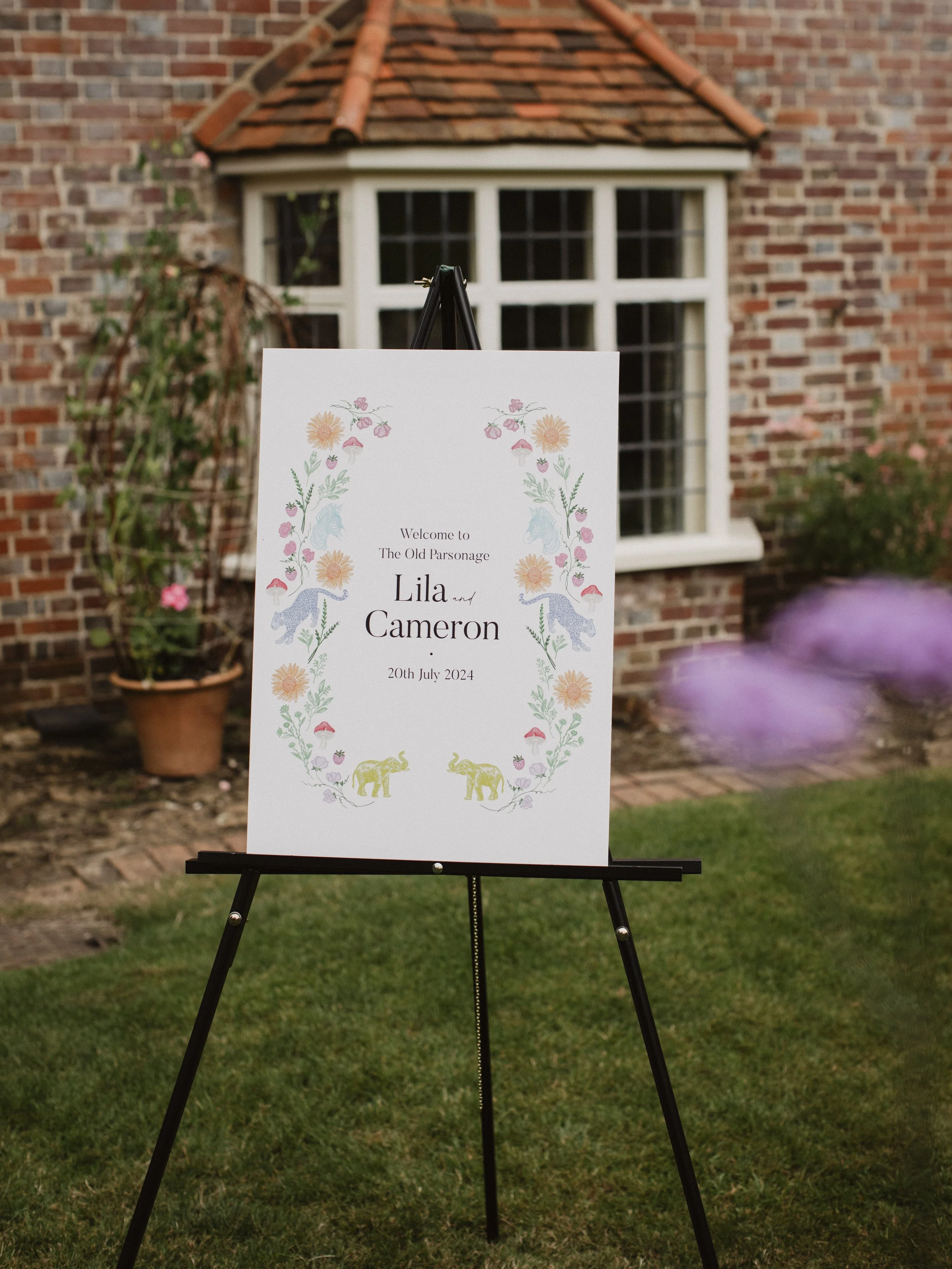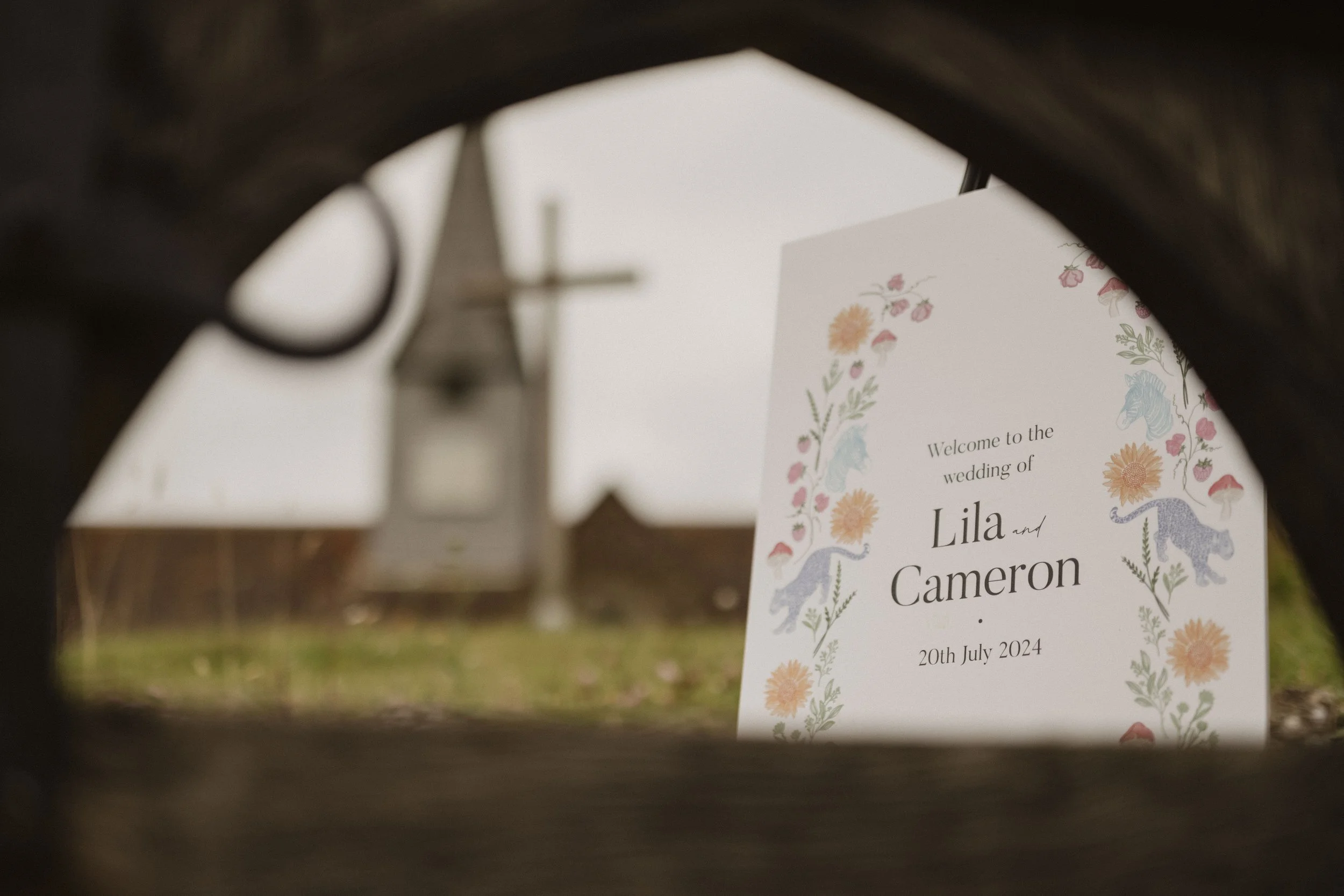 I designed bespoke wedding invitations and supporting collateral for Lila and Cameron that reflected their shared memories, heritage, and the personal setting of their celebration. Drawing inspiration from Cameron’s South African roots and safari adventures, alongside the British garden setting of Lila’s family home—where sweet peas and sunflowers had been carefully cultivated—the design brought together country wildflowers, raspberries and foraged mushrooms with illustrated zebras, elephants and leopards. The collection balanced romance and playfulness, blending countryside charm with safari storytelling. Alongside the invitations, I also created a traditional order of service featuring family readings and songs, incorporating a classic emblem with a modern, personal twist to reflect the couple’s preference for something timeless yet distinctive. I also designed directional signage for the church, Lila’s parents’ home, and the reception venue, extending the original invitation concept across the wider wedding collateral to ensure a cohesive and considered visual experience throughout.